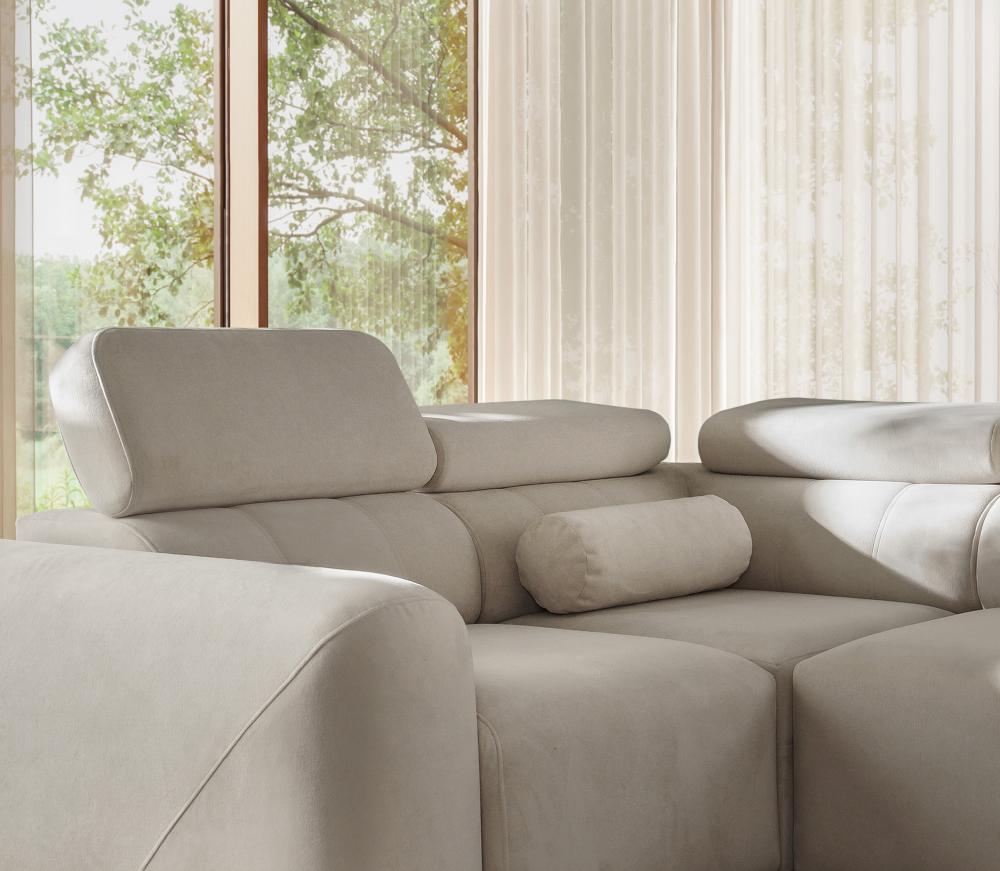 Funkcja spania typu PUMA zapewnia szybkie i łatwe rozkładanie. Powierzchnia spania o wymiarach 268 × 132 cm sprawdzi się doskonale zarówno podczas noclegu gości, jak i w codziennym użytkowaniu. Dwa pojemne schowki na pościel pomogą zachować porządek i zaoszczędzić przestrzeń, a sześć regulowanych zagłówków pozwoli każdemu domownikowi dopasować oparcie do własnych potrzeb.