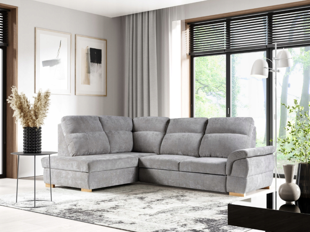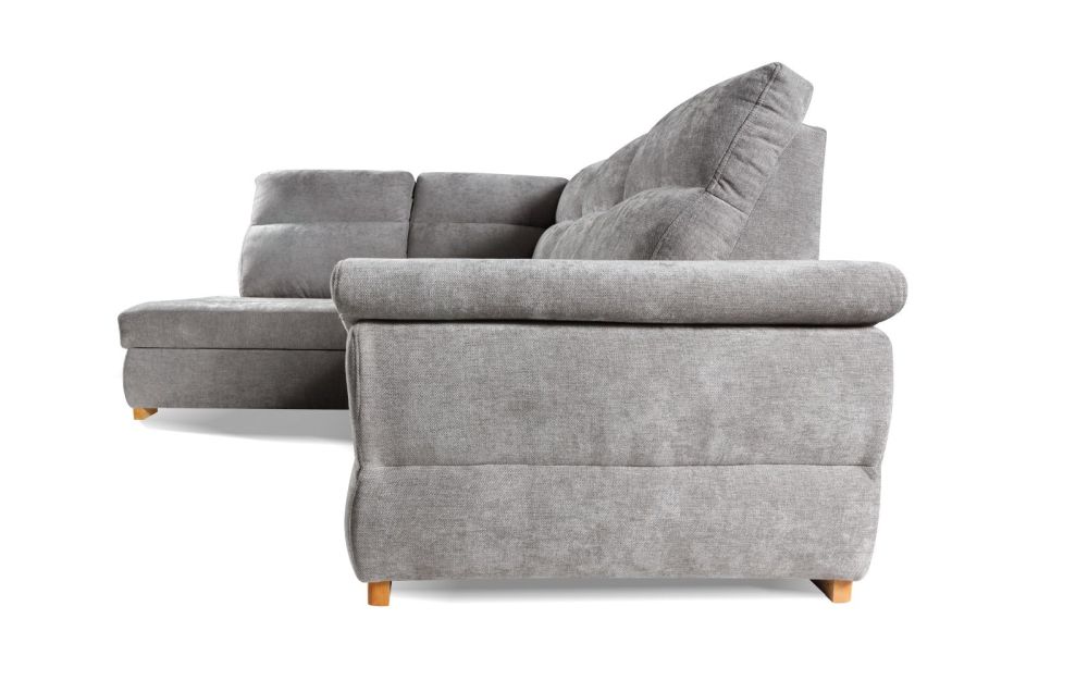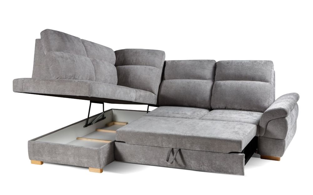 Wyjątkową wygodę siedzenia i spania zapewniają sprężyny faliste w siedziskach w połączeniu z wysokiej jakości pianką tapicerską. Konstrukcja oparta na litym drewnie oraz płycie meblowej to pewność solidności i odporności na intensywne użytkowanie. Funkcja spania codziennego oraz sprawdzony system rozkładania DL pozwalają szybko i wygodnie zmienić narożnik w przestronne łóżko. Dodatkowym atutem jest praktyczny pojemnik na pościel, który ułatwia utrzymanie porządku.