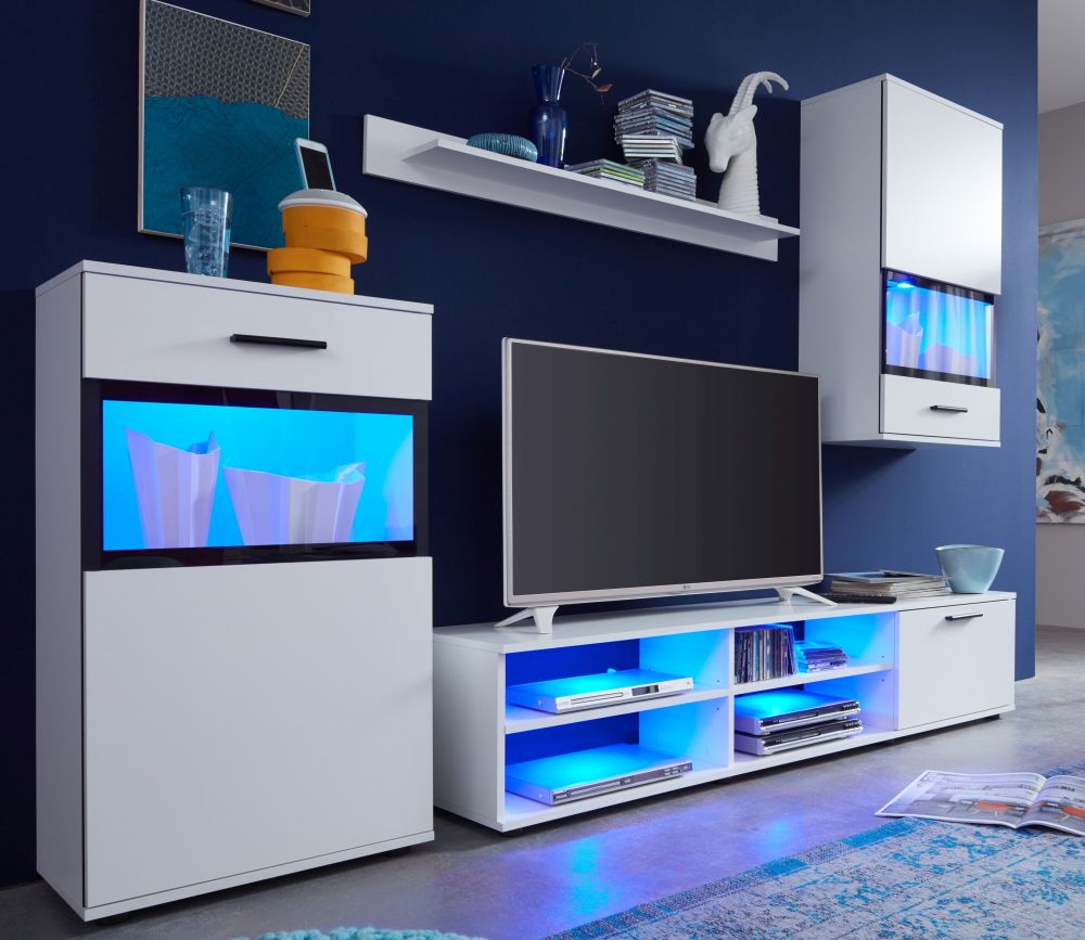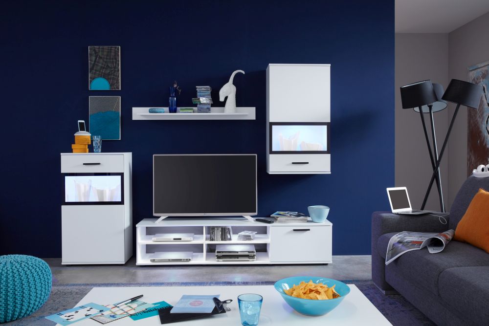Biała mini meblościanka SWINGER składa się z kilku elementów, które można dowolnie zestawiać i dostosowywać do własnych potrzeb. Zawiera liczne półki, wnęki i szafkę rtv, które zapewniają wiele miejsca do przechowywania. Możesz umieścić na niej książki, dekoracje, zdjęcia, naczynia, sprzęt elektroniczny i wiele innych przedmiotów, które chcesz mieć w zasięgu ręki.