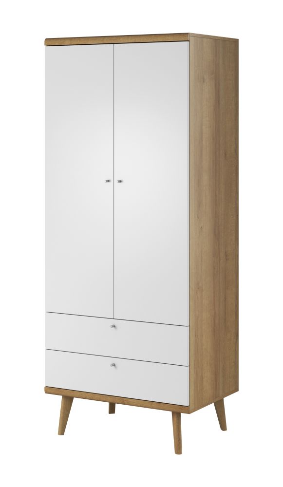 Dzięki wyjątkowemu zestawieniu materiałów i kolorów, biała szafa w stylu skandynawskim PRIMAVERA 80 wpisuje się doskonale w skandynawski styl, który charakteryzuje się minimalistycznym designem i przyjemną dla oka estetyką. Biały front szafy nadaje jej świeżości i jasności, natomiast dębowy dekor i drewniane nogi dodają jej ciepłego akcentu.