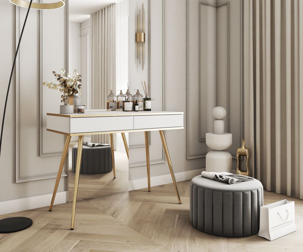 Dzięki wysokim metalowym nogom (dostępnym w kolorze czarnym lub złotym), toaletka HOMLA nie tylko dodaje wnętrzu lekkości i elegancji, ale również ułatwia utrzymanie czystości. Sprzątanie staje się prostsze, zarówno dla robotów sprzątających, jak i przy ręcznym odkurzaniu. To rozwiązanie, które spełnia oczekiwania najbardziej wymagających klientów ceniących praktyczność w codziennym życiu.