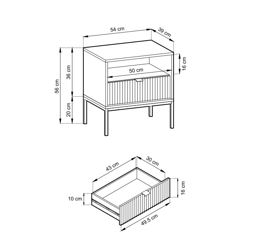 Dzięki swoim kompaktowym wymiarom (szerokość 54cm, głębokość 39cm, wysokość 56cm), nasz biały stolik nocny struktura doskonale sprawdzi się zarówno jako funkcjonalne miejsce na nocną lampkę, jak i elegancki dodatek do Twojej sypialni.