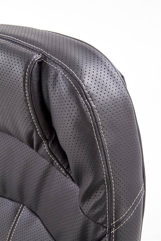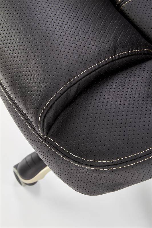 Fotel CARLOS w kolorze czarnym prezentuje się niezwykle stylowo i ponadczasowo. Wykonany z ekoskóry perforowanej, jest przyjemny w dotyku i zapewnia odpowiednią wentylację nawet podczas długotrwałego użytkowania. To doskonałe rozwiązanie dla osób ceniących sobie wysoką jakość i wygodę.