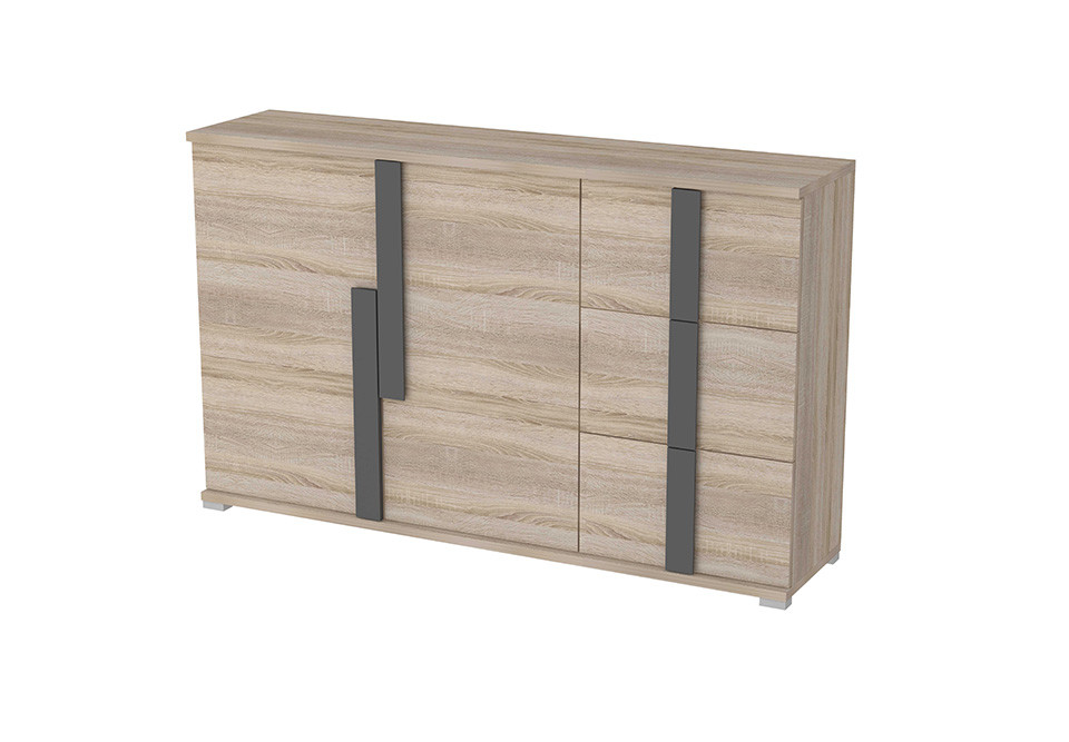 Prezentowana dąb sonoma meblościanka się z komody i szafki RTV, co sprawia, że jest bardzo funkcjonalny i pozwala na przechowywanie różnych rzeczy w salonie. Wymiary zestawu to 310 / 198 / 37-47 cm, co oznacza, że meblościanka zajmuje niewiele miejsca, a jednocześnie oferuje dużo miejsca na przechowywanie.