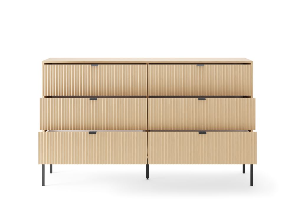 Solidna budowa z najwyższej jakości płyty laminowanej została wykończona odpornymi na uszkodzenia obrzeżami ABS, co czyni komodę trwałą i odporną na codzienne użytkowanie. Sześć pojemnych szuflad gwarantuje wygodne przechowywanie, a minimalistyczne, czarne metalowe uchwyty i smukłe nóżki dodają całości loftowego, designerskiego charakteru.