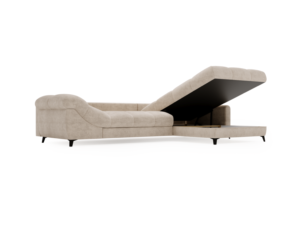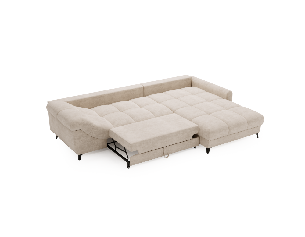 Rozkładana funkcja spania oraz wbudowany pojemnik na pościel czynią ten model niezwykle praktycznym, zwłaszcza dla rodzin lub osób, które często przyjmują gości. Całość opiera się na solidnych, metalowych nóżkach, które podkreślają nowoczesny charakter mebla i ułatwiają utrzymanie porządku.