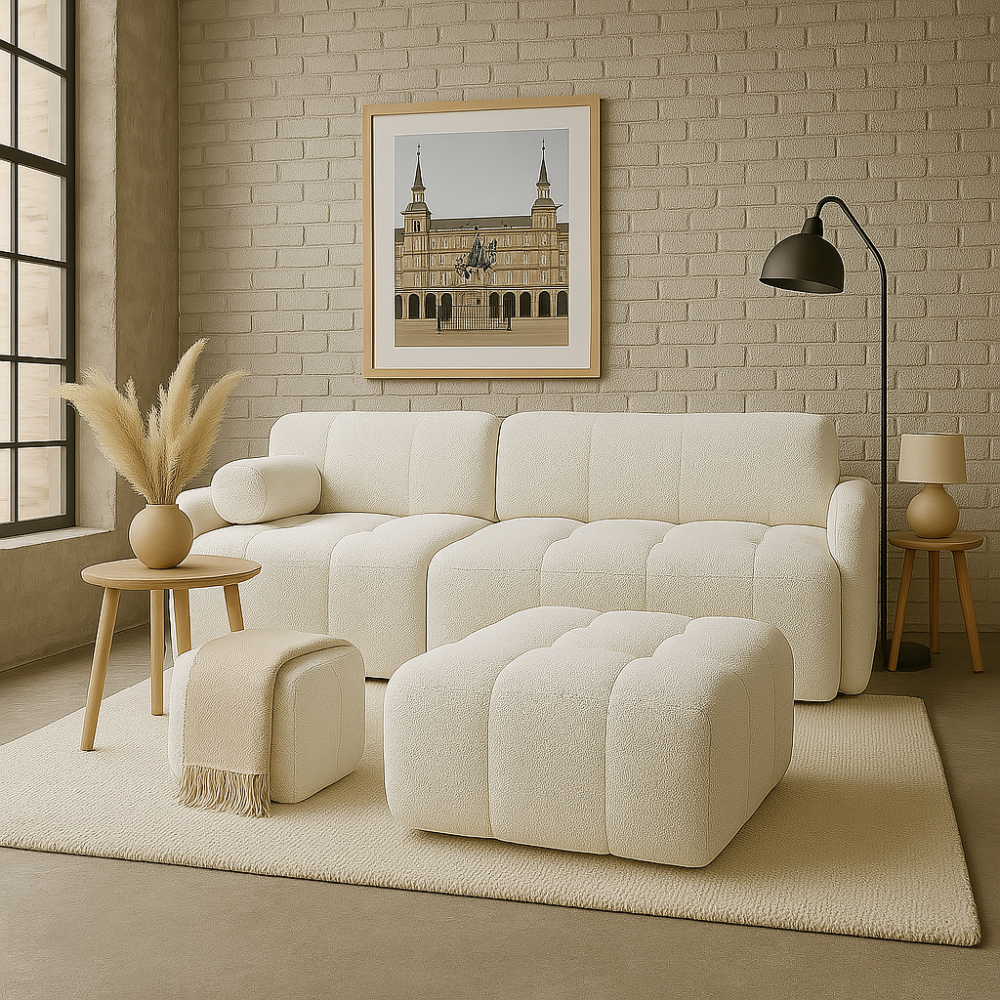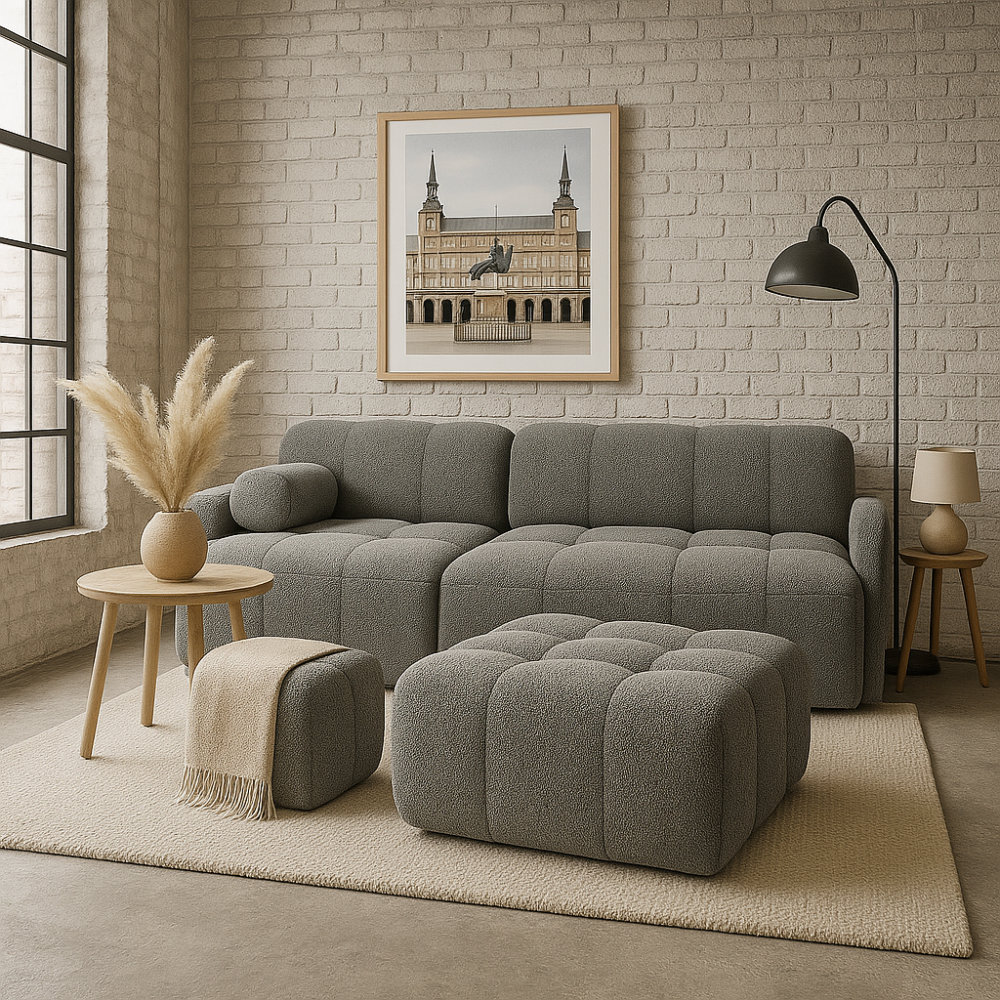 Pufa zachwyca miękkością i jakością wykonania – sprężyny w siedzisku oraz solidna pianka tapicerska zapewniają wygodę, która nie przemija. Całość oparta na trwałej konstrukcji z litego drewna i płyty HDF daje stabilność i odporność na lata codziennego użytkowania. Tapicerka? Przyjemna w dotyku, odporna na zużycie, dostępna w wielu stylowych kolorach – od stonowanych beży i szarości po odważniejsze akcenty. To Ty decydujesz, jak będzie wyglądać Twój zestaw.