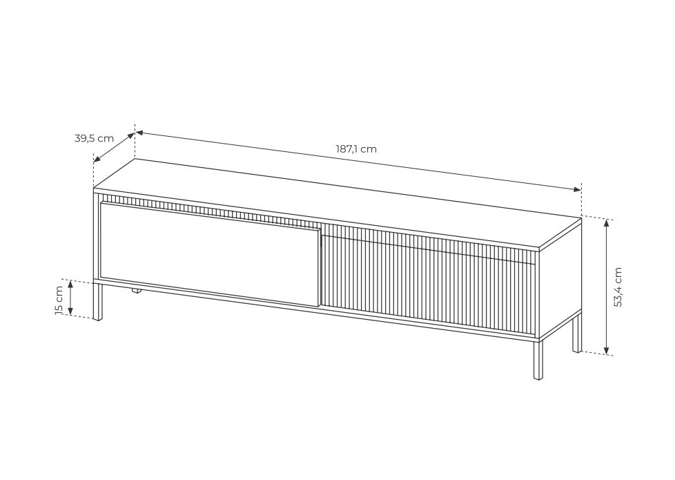 - szerokość 187,1 cm / wysokość 53,4 cm / głębokość 39,5 cm,