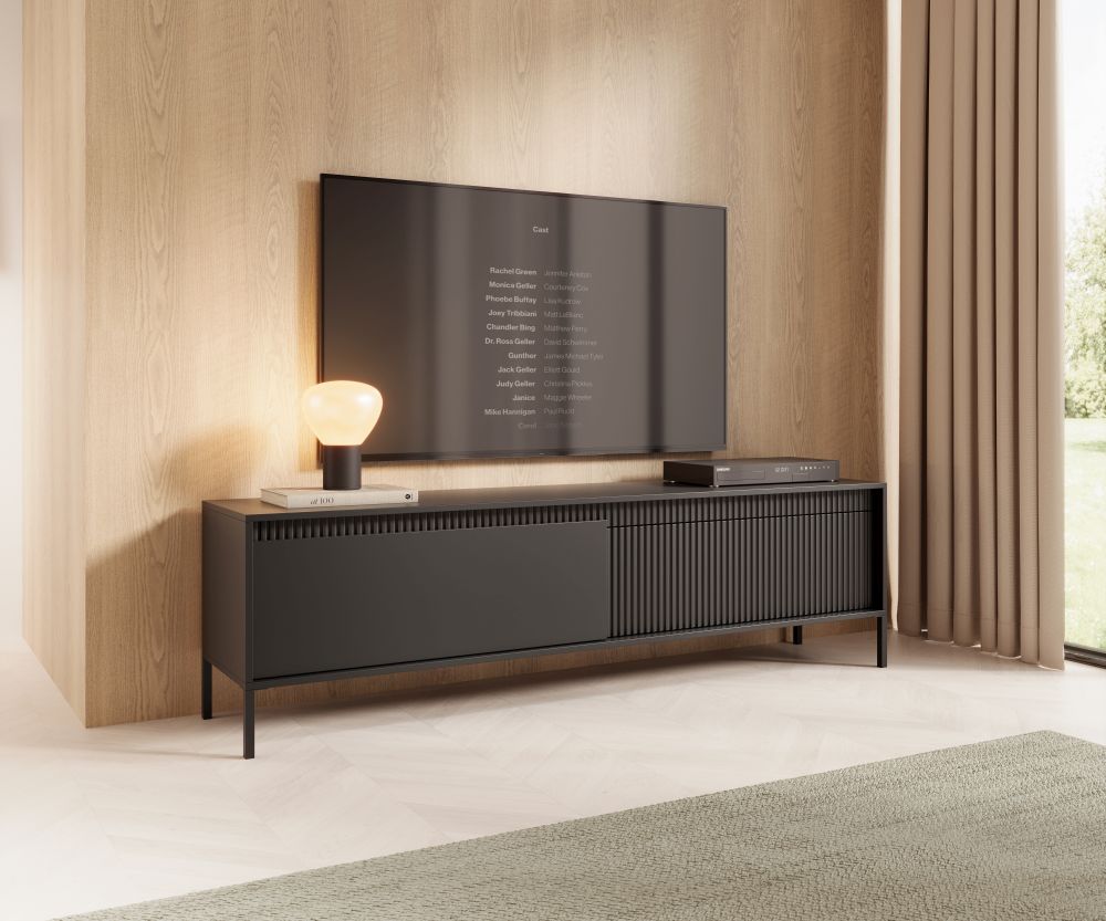 Stolik RTV AGATA przyciąga wzrok minimalistycznym, a zarazem luksusowym designem. Czarny kolor dodaje mu wyrafinowanego charakteru, który podkreśli elegancję Twojego salonu. Fronty z ryflowanej płyty MDF to detal, który wprowadza do wnętrza subtelną dynamikę i niepowtarzalny styl. Obrzeża ABS oraz płyta EOS o wysokiej jakości gwarantują trwałość i odporność na codzienne użytkowanie.