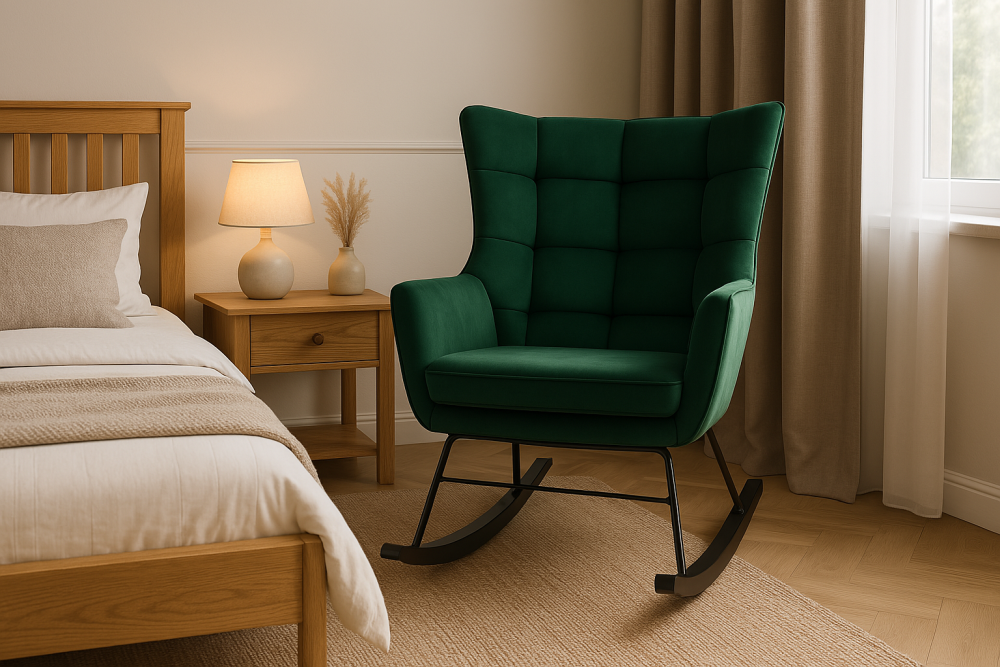 Fotel bujany butelkowa zieleń BAZYLIUSZ doskonale wpisuje się w nowoczesne wnętrza, dodając im wyjątkowego charakteru. Jest nie tylko stylowym dodatkiem do salonu czy pokoju dziennego, ale także zapewnia wygodne miejsce do odpoczynku po długim dniu. Dzięki funkcji bujania można w nim rozluźnić się, czytając ulubioną książkę lub delektując się chwilą spokoju.