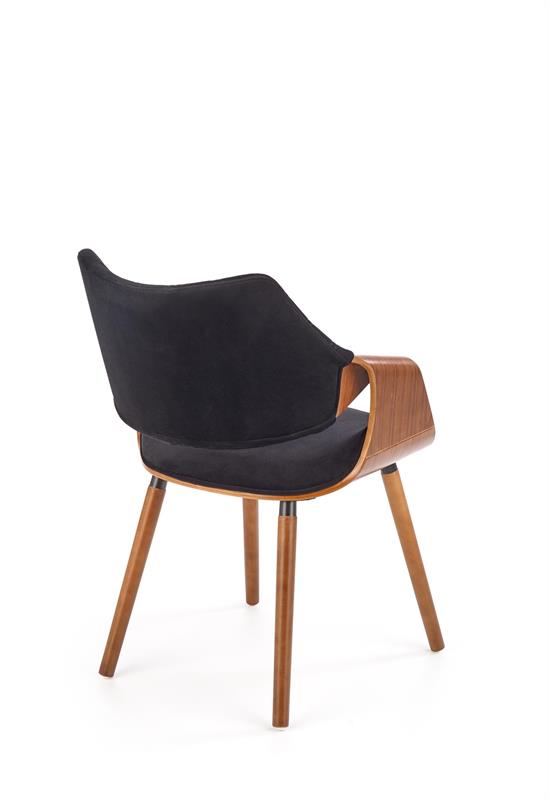 Krzesło K396 w kolorze orzechowym z czarnym obiciem to elegancki mebel łączący nowoczesny design z klasycznym wykończeniem. Wykonane z giętej sklejki, litego drewna i miękkiej tkaniny, zapewnia komfort oraz solidność. Jego styl świetnie komponuje się zarówno z nowoczesnymi, jak i klasycznymi wnętrzami. Idealnie pasuje do stołów z naturalnego drewna, szczególnie w ciepłych odcieniach orzecha, ale także do minimalistycznych blatów w czerni czy antracycie. Marka Meble Arkadius oferuje to krzesło jako doskonały wybór dla osób ceniących połączenie wygody i elegancji w swoim wnętrzu.