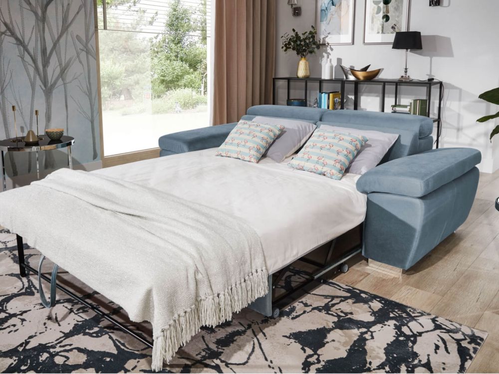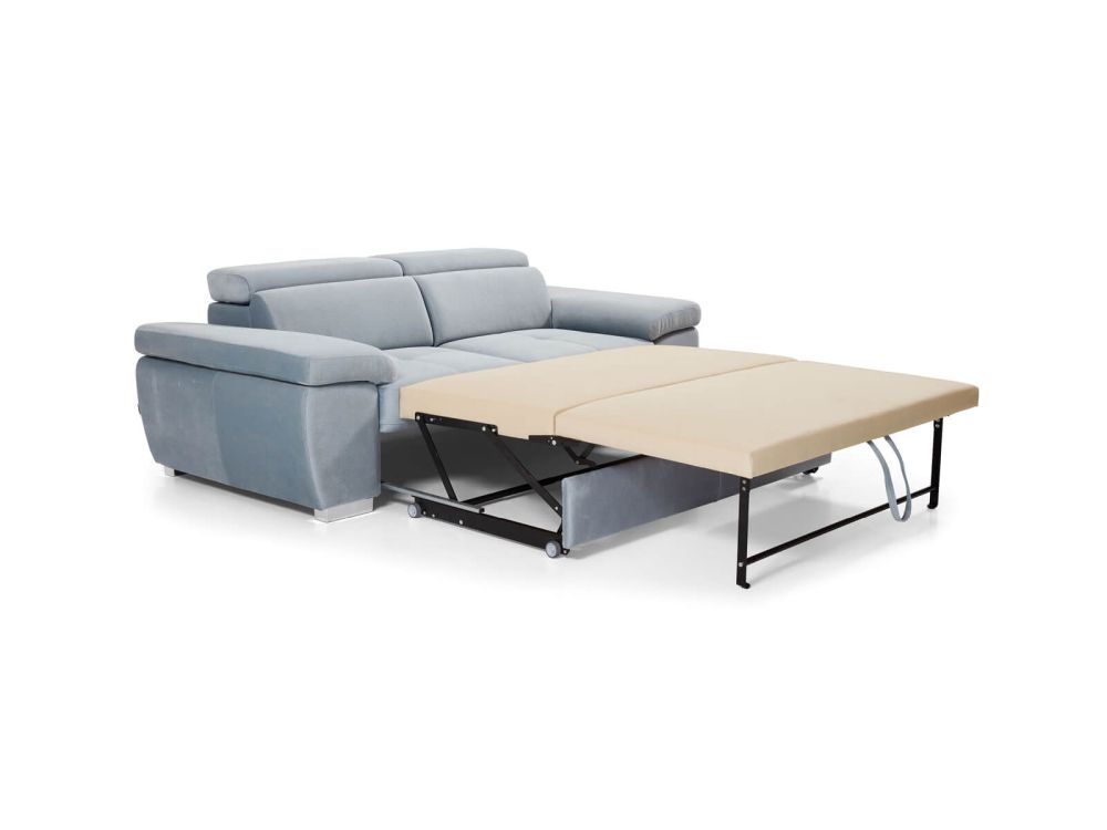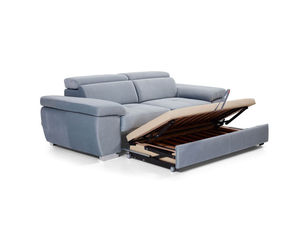 Ta kanapa to więcej niż tylko miejsce do siedzenia – to prawdziwa transformacyjna królowa przestrzeni. W ciągu dnia elegancka, przestronna sofa o minimalistycznych liniach, nocą zaś błyskawicznie zamienia się w wygodne łóżko dzięki innowacyjnemu systemowi wózka, który działa płynnie jak szwajcarski zegarek.