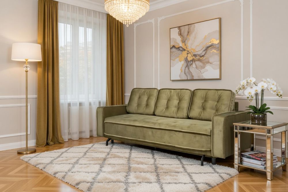 Ten model świetnie wpisuje się w aktualne trendy wnętrzarskie – łączy minimalistyczną bryłę z dekoracyjnymi detalami. To doskonały wybór dla osób, które cenią styl glamour, modern classic lub nowoczesną elegancję. Kanapa z guzikami TUSSO może stać się efektownym centrum salonu i jednocześnie praktycznym rozwiązaniem do spania.
