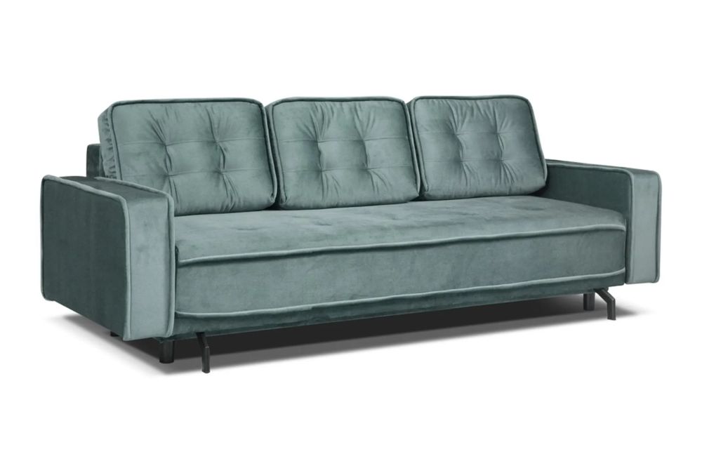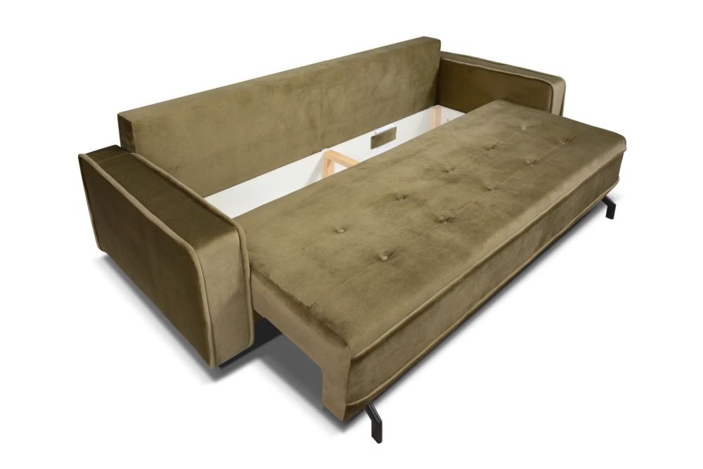Dodatkowym atutem jest pojemnik na pościel, który pozwala wygodnie przechowywać kołdrę, poduszki czy dodatkowy koc, pomagając utrzymać porządek w salonie.