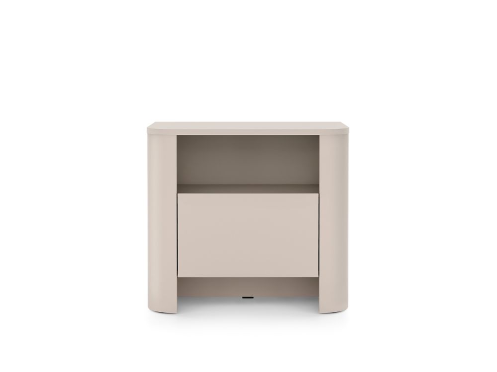 Stolik nocny BALO to kwintesencja nowoczesnego designu w przytulnym, kaszmirowym wydaniu. Jego obła, łagodna forma doskonale wpisuje się w aktualne wnętrzarskie trendy, a modny kaszmirowy kolor nadaje wnętrzu ciepła, harmonii i elegancji. Ten model to część wyjątkowej kolekcji mebli BALO, która łączy funkcjonalność z subtelną estetyką.