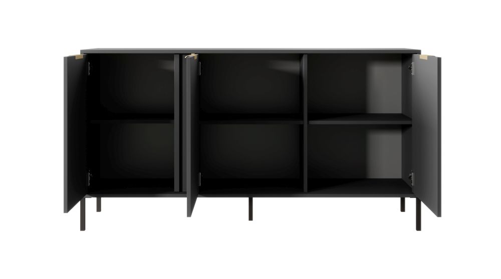 Komoda 153 cm szerokości Laudate w kolorze antracytu to kwintesencja nowoczesnego designu i funkcjonalności. Jej elegancki wygląd i solidne wykonanie sprawiają, że doskonale wpisuje się w różnorodne aranżacje wnętrz. Złote, krawędziowe uchwyty nadają jej subtelny akcent luksusu, podkreślając jednocześnie minimalistyczny charakter. Solidne, metalowe nogi zapewniają stabilność i trwałość, podczas gdy grafitowe wykończenie HDF szafek i szuflad dodaje jej wyjątkowego uroku.