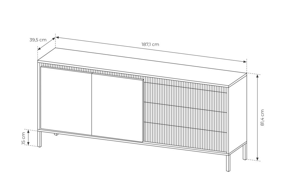 - szerokość 187,1 cm / wysokość 81,4 cm / głębokość 39,5 cm,