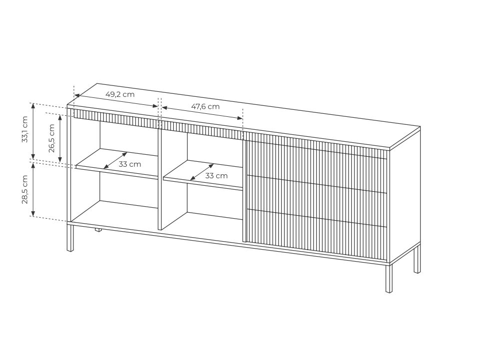 Zaprojektowana z myślą o praktyczności, komoda oferuje trzy pojemne szuflady i dwie przestronne szafki. Dzięki systemowi push-to-open otwieranie jest łatwe i wygodne, a jednocześnie dodaje meblowi nowoczesnego uroku. Idealnie sprawdzi się do przechowywania tekstyliów, dokumentów czy dekoracji, pozwalając zachować porządek w salonie.