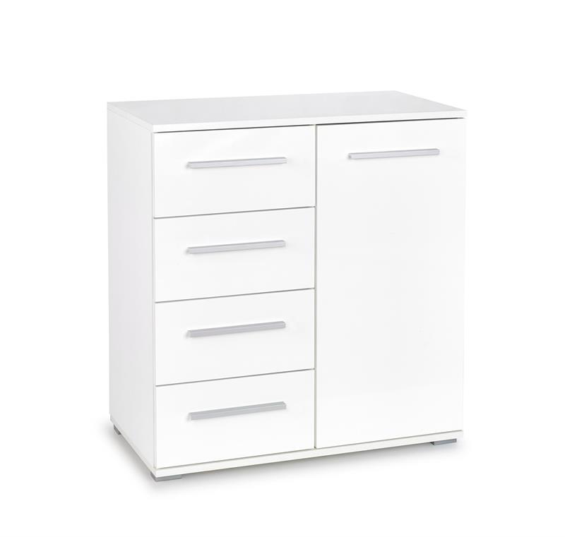 Wnętrze komody oferuje praktyczne rozwiązania przechowywania. Znajdziesz tutaj półeczkę i aż cztery pojemne szuflady, które pomieszczą wiele przedmiotów, utrzymując porządek w Twoim pomieszczeniu. Dodatkowo, zestaw zawiera aluminiowe uchwyty, które nadają komodzie wyjątkowego charakteru.