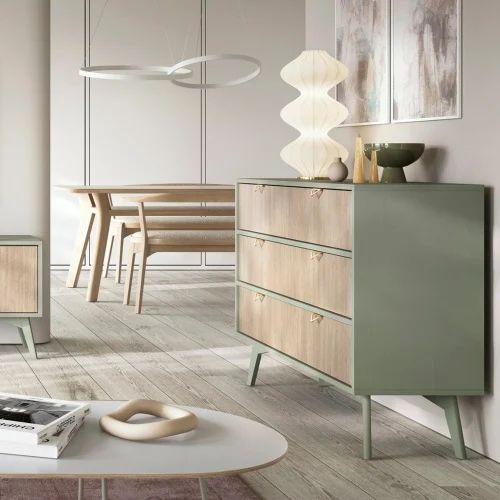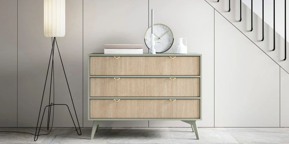 Co wyróżnia komodę BAUM? To przede wszystkim połączenie naturalnych kolorów – eukaliptusa, jodełki scandi oraz beżu piaskowego – które nadają meblowi niepowtarzalnego uroku i wyjątkowego charakteru. Te subtelne, stonowane odcienie idealnie współgrają z różnymi stylami aranżacyjnymi, dodając pomieszczeniu przytulności i elegancji.