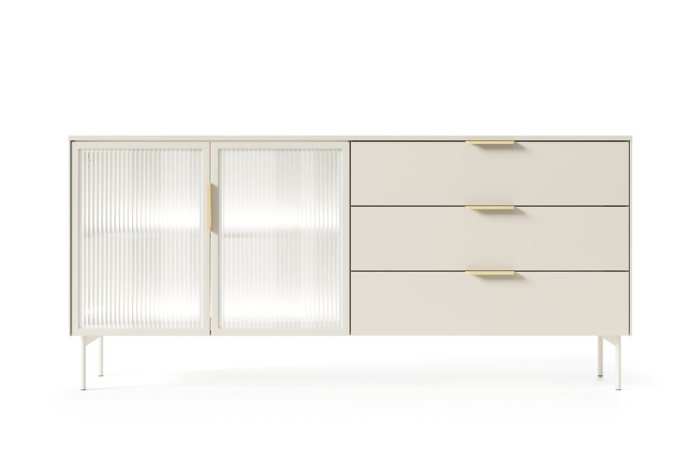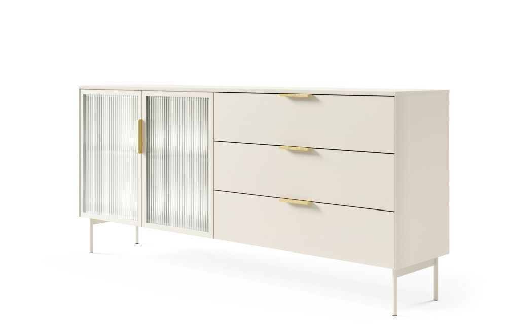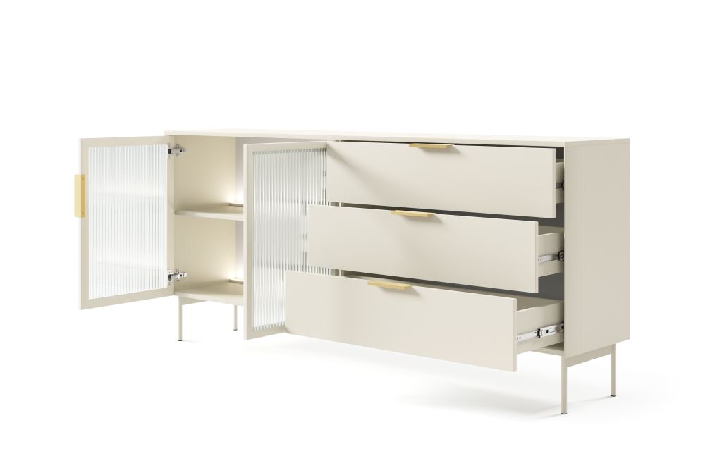 Komoda HAMBURG z trzema szufladami i ornamentową szybą to wyważona gra kontrastów: matowy kaszmir spotyka się tu z przejrzystym szkłem hartowanym w unikalnym wzorze flutes, tworząc efekt subtelnej głębi i lekkości. Fronty w ramkach MDF, dopełnione delikatnie złoconymi uchwytami w anodowanym wykończeniu, dodają całości elegancji, która nie narzuca się, ale urzeka od pierwszego spojrzenia.