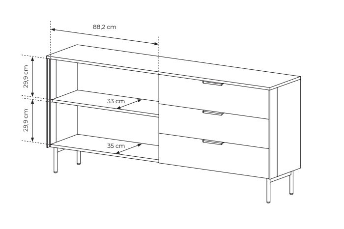 Komoda została zaprojektowana z dbałością o każdy szczegół: pełen wysuw szuflad na kulkowych prowadnicach zapewnia wygodę użytkowania, a wysokiej jakości płyta laminowana E05 i listwy MDF gwarantują trwałość na lata. To mebel, który spełni oczekiwania nawet najbardziej wymagających.