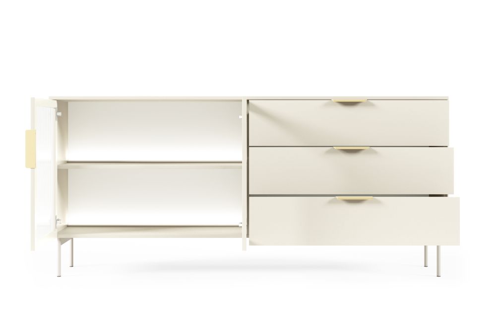 Co wyróżnia ten mebel? Zdecydowanie detale: metalowe, smukłe nóżki w kolorze kaszmiru, białe wnętrze z wykończeniem HDF, a przede wszystkim — wbudowane oświetlenie LED, które nie tylko podkreśla bryłę komody, ale wieczorem tworzy wyjątkową atmosferę w pomieszczeniu. Neutralna biel światła wydobywa szlachetność materiałów i tworzy prawdziwą scenę dla Twoich dodatków i dekoracji.