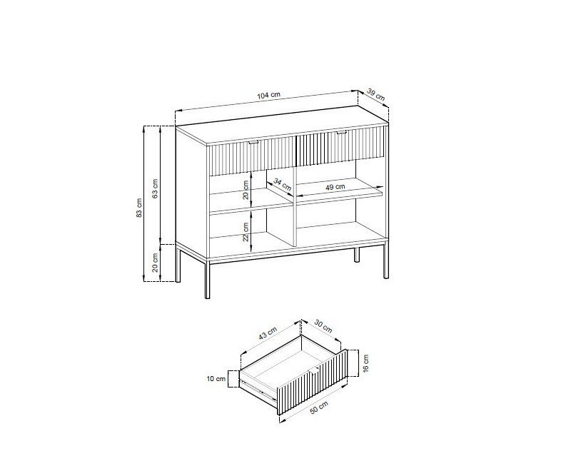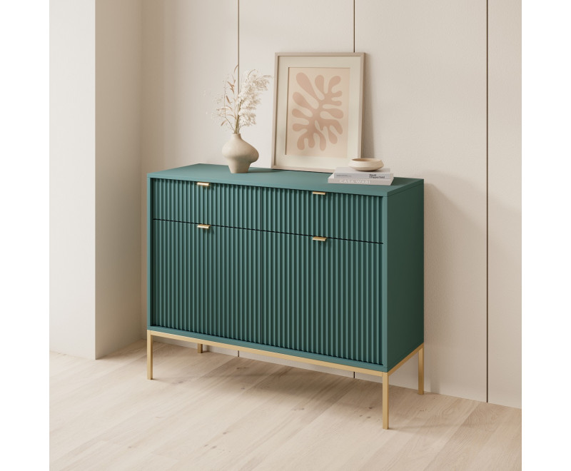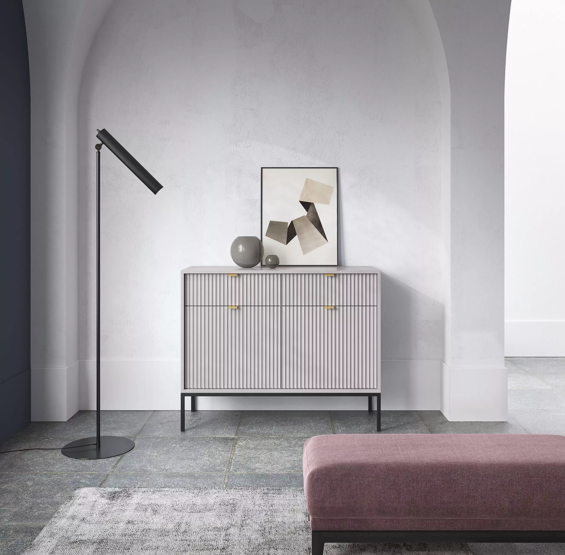 Specyfikacja komody obejmuje korpusy i fronty w kolorach czarnym, jasnym szarym i białym. Do wyboru jest również stelaż w złotym lub czarnym kolorze, pozwalając dopasować komodę do swojego stylu. Fronty wykonane są z ryflowanego MDF-u o grubości 18 mm, a okleina ABS oraz solidna płyta wiórowa zapewniają trwałość i wytrzymałość.