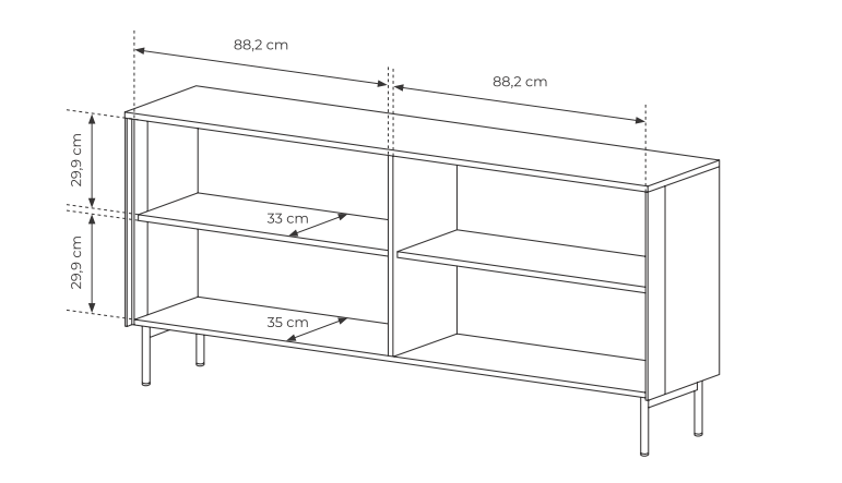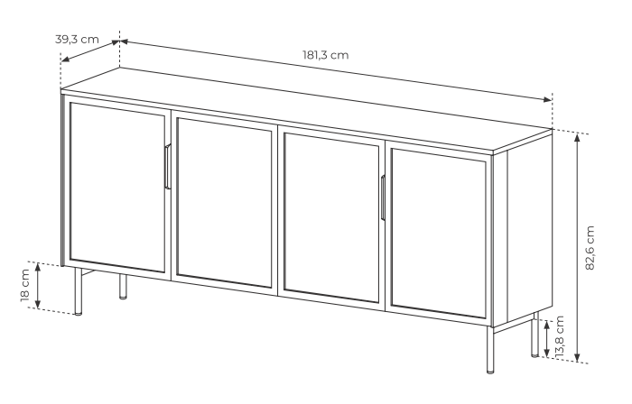 Wymiary komody: szerokość 181,3 cm / wysokość 82,6 cm / głębokość 39,3 cm / nogi 13,8 cm