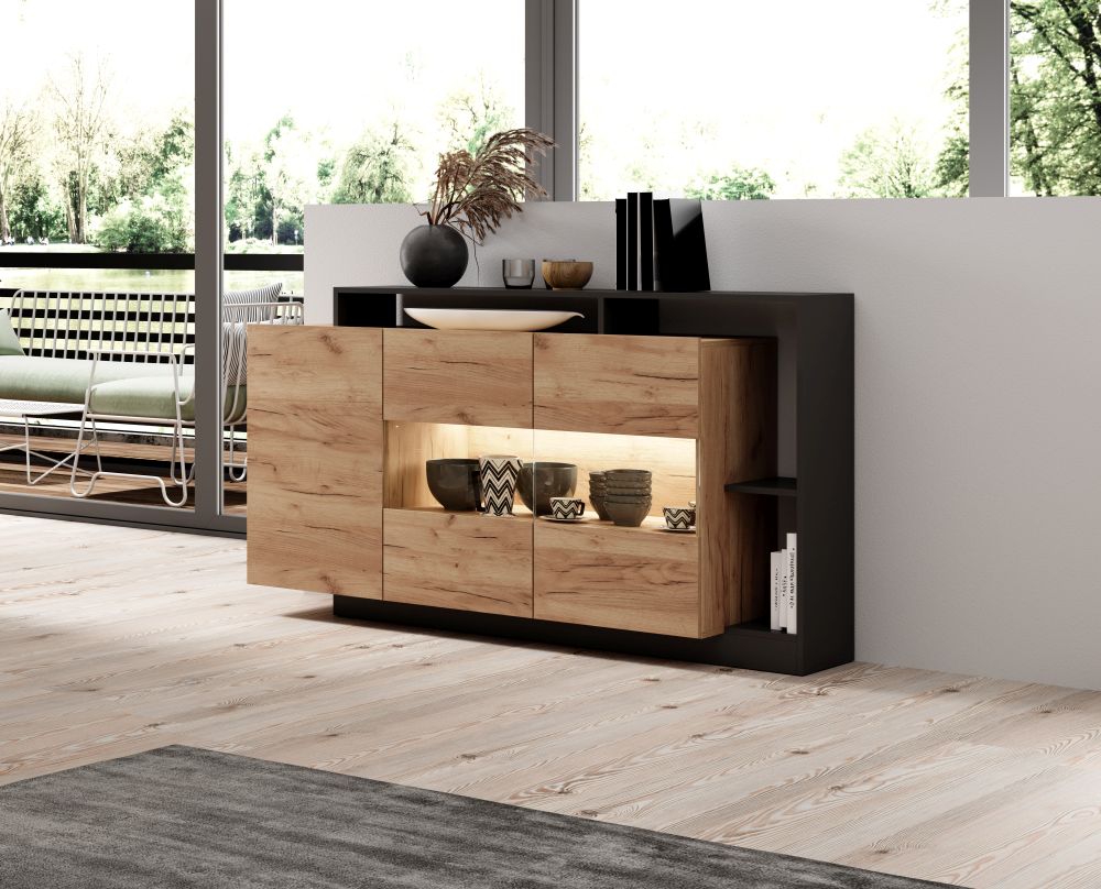Zanurz się w niepowtarzalnym uroku elegancji i funkcjonalności z komodą witryną barek ALESSIA. Ta wyjątkowa komoda witryna barek emanuje luksusem dzięki swojej wyrafinowanej kolorystyce dębu craft złotego w harmonii z antracytowymi akcentami. Wykonana z najwyższej jakości płyty laminowanej, każdy detal komody odzwierciedla dbałość o najmniejsze szczegóły.