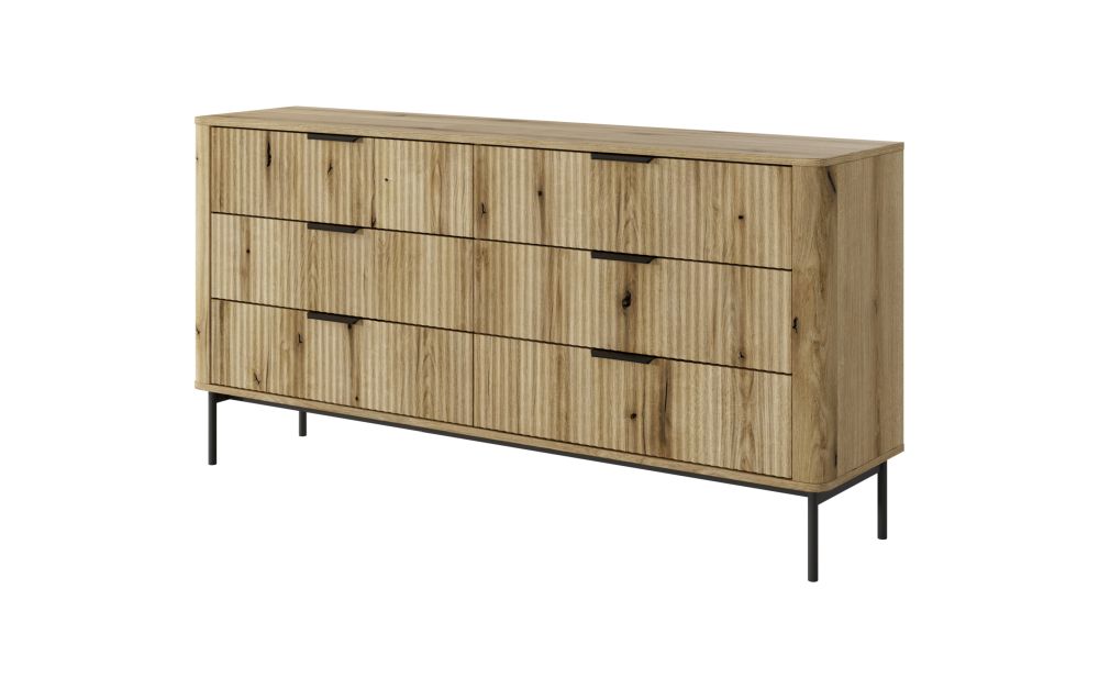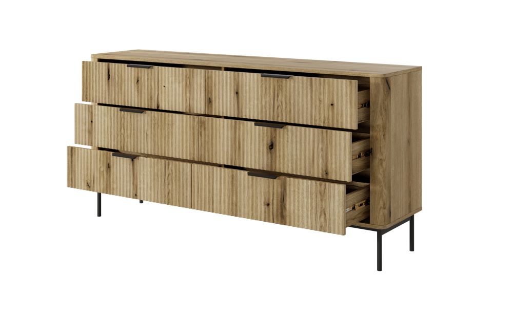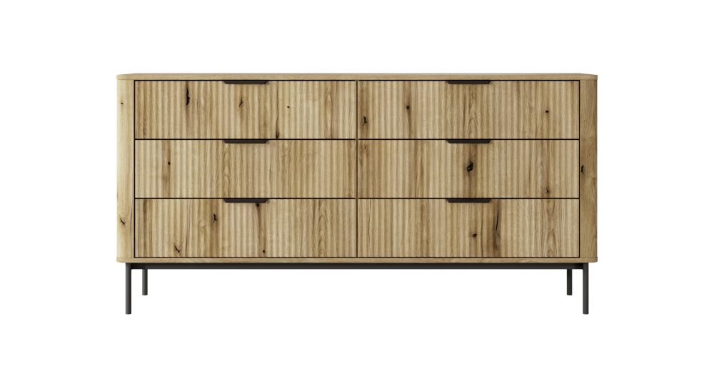 Komoda z niemiec 6 szuflad Willkommen to połączenie nowoczesnego designu i funkcjonalności, które zapewnią Twojemu wnętrzu wyjątkowy charakter. Inspirujący kontrast między dębem evoke a czarną ramką dodaje meblowi elegancji i wyrafinowania. Dzięki złotym akcentom komoda emanuje subtelnością i luksusem. Metalowe uchwyty w kolorze czarnym mat doskonale komponują się z resztą kompozycji, dodając jej industrialnego uroku.