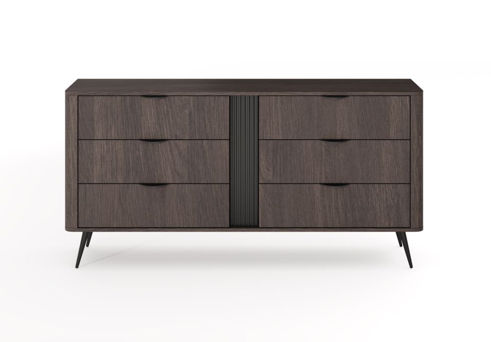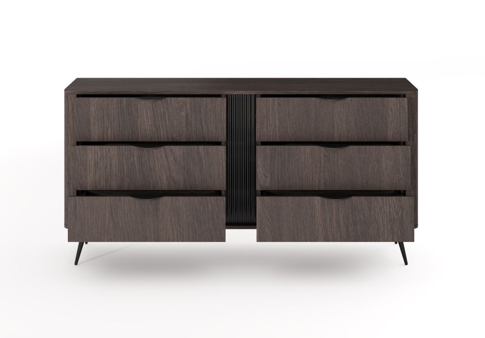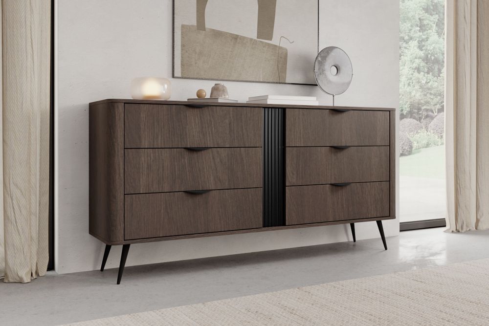 Z zaokrąglonymi bokami, ryflowanymi wstawkami i ciemnym, szlachetnym wybarwieniem dąb dunin, komoda wygląda tak, jakby w salonie zapadł zmierzch — ciepły, otulający, pełen spokoju. Jej smukła forma i czarne, wysokie, metalowe nogi sprawiają, że mimo solidności wizualnej nie przytłacza przestrzeni. To mebel z charakterem, ale i z lekkością.