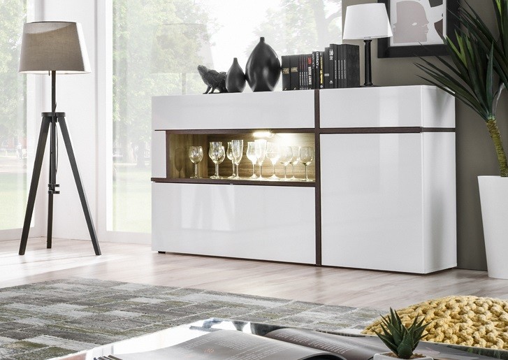Komoda z witryną do salonu CROATIA. Komoda CROATIA – przeszklona komoda, która łączy w sobie funkcję zarówno klasycznej komody jak i elementów charakterystycznych dla witryny. Mebel posiada częściowo oszklony front, który wygodnie otworzysz dzięki bezuchwytowemu systemowi \, wstawki w komodzie podkreślone są materiałem w odcieniach ciemnego brązu.