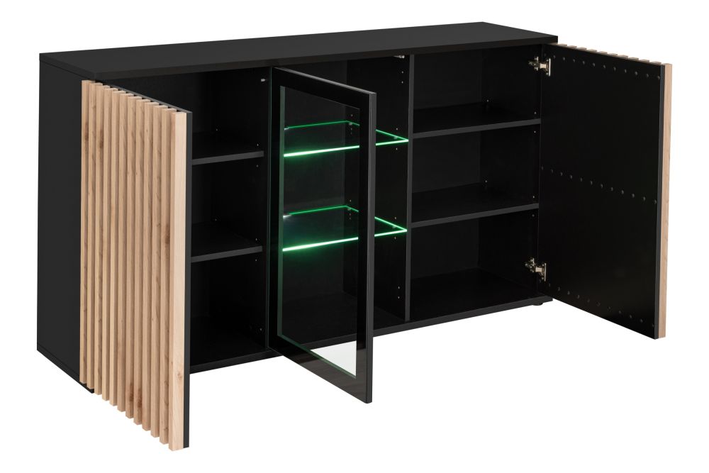 Komoda California wyróżnia się unikalnym połączeniem kolorów i materiałów. Fronty w kolorze czarnym oraz czarne szkło sitodruk harmonijnie współgrają z efektownymi lamelami imitującymi drewno. Ten subtelny kontrast nadaje meblowi niezwykłego uroku.