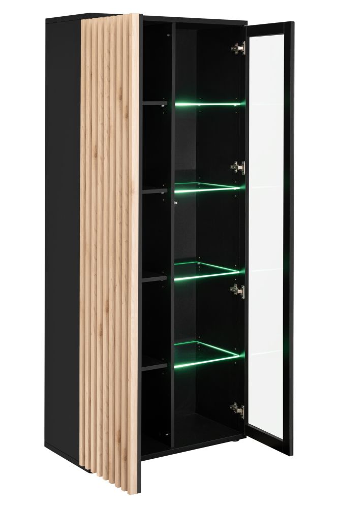 Wymiary tej witryny są doskonale dopasowane do różnych wnętrz – szerokość 80 cm, wysokość 192 cm i głębokość 40 cm pozwalają na umieszczenie jej nawet w mniejszych przestrzeniach. Kolorystyka, która łączy czarny z czarnym szkłem sitodruk i lamele w kolorze drewna, nadaje meblowi nowoczesnego i stylowego wyrazu.