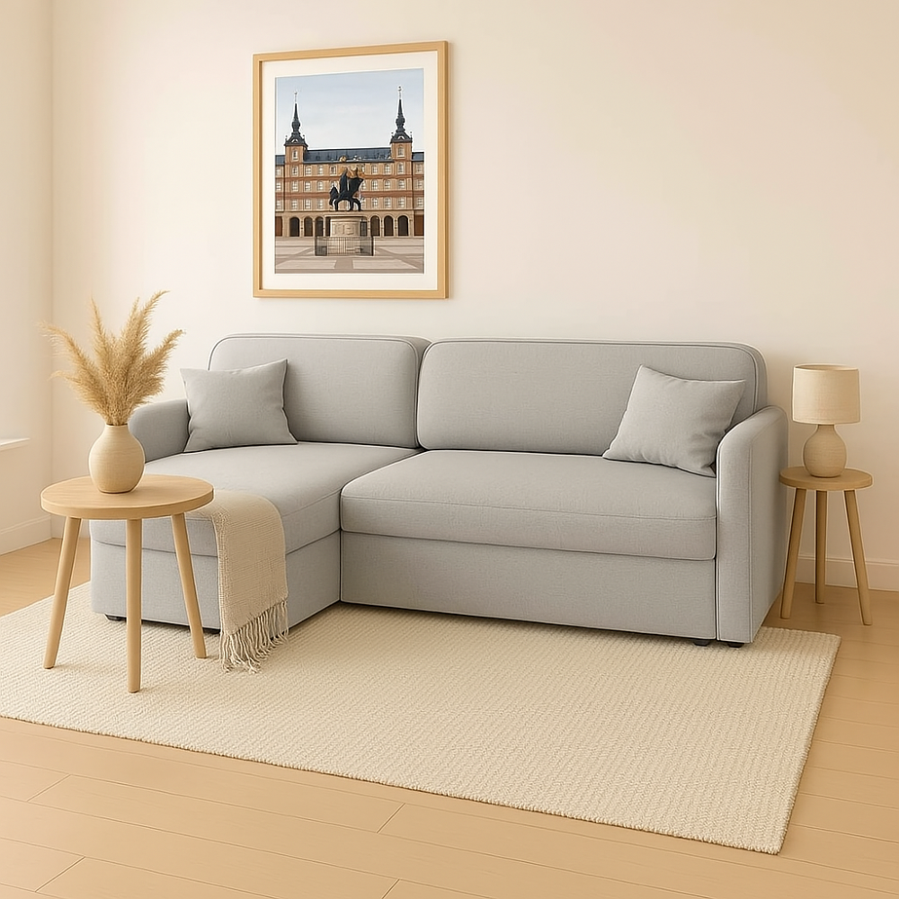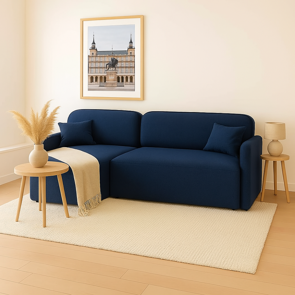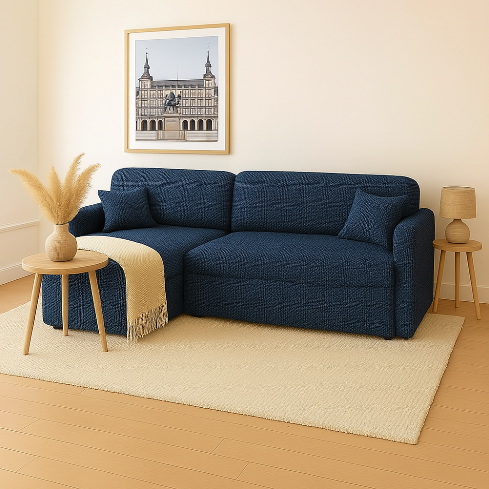 Rozkładanie? Bezproblemowe. Kilka prostych ruchów i masz gotową powierzchnię do spania o wymiarach niemal jak pełnowymiarowe łóżko – 135 × 195 cm. Praktyczny pojemnik ukryty w konstrukcji pozwala schować pościel lub inne tekstylia, pomagając utrzymać porządek w mieszkaniu bez wysiłku.
