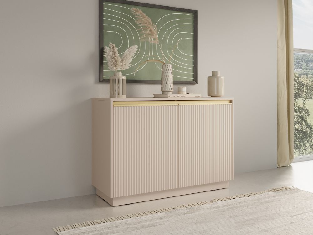 Komoda DIANA to harmonia elegancji, a jednym z jej najbardziej charakterystycznych elementów są szczotkowane, złote uchwyty. Wykonane z aluminium, dodają one wyrafinowanego blasku, który idealnie komponuje się z piaskowym beżem mebla. Dzięki temu delikatnemu akcentowi, komoda staje się centralnym punktem każdego wnętrza, subtelnie przyciągając uwagę swoim luksusowym wyglądem.