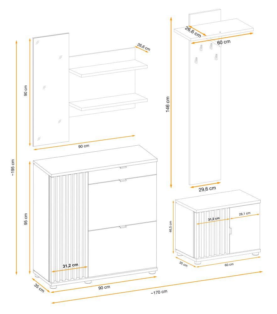 Wieszak panelowy zapewnia miejsce do zawieszenia odzieży, co ułatwia utrzymanie porządku w przedpokoju. Wysoka szafka na buty pozwala przechowywać obuwie w sposób uporządkowany i chroni je przed kurzem. Szafka z tapicerowanym siedziskiem to doskonałe rozwiązanie dla osób chcących wygodnie ubrać się przed wyjściem lub zdjąć buty po powrocie do domu. Podwójna półka z lustrem nie tylko pełni funkcję praktyczną, ale również optycznie powiększa przestrzeń i dodaje jej jasności.