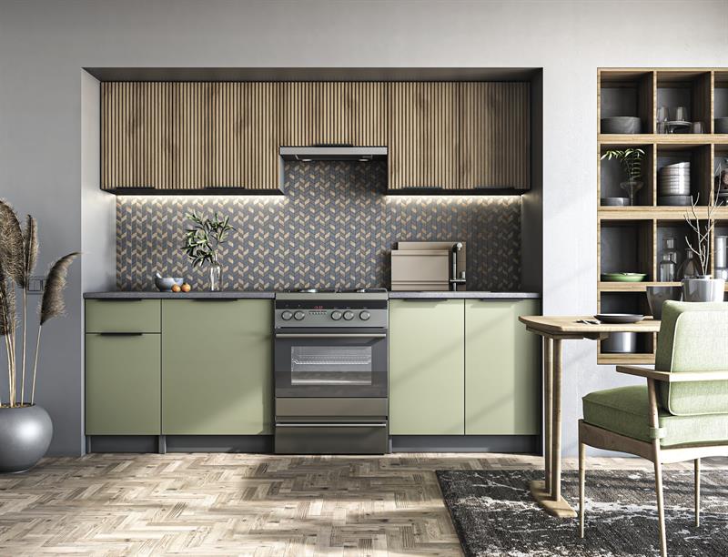 Meble kuchenne pistacjowe z jasnymi lamelami KSENIA
