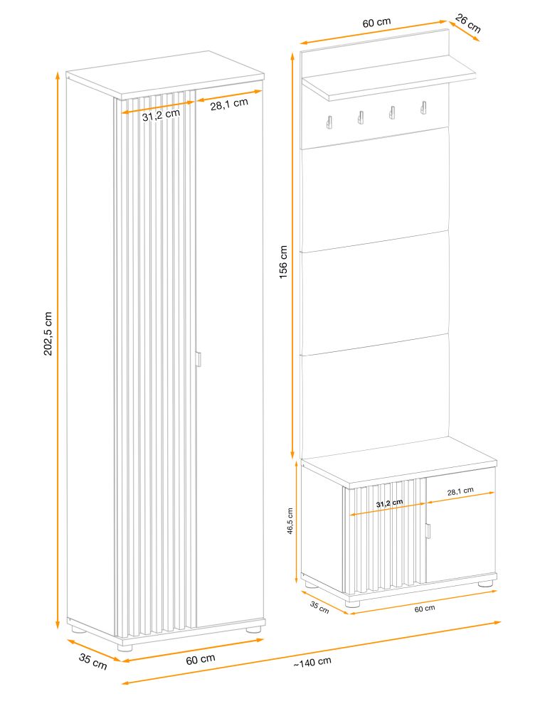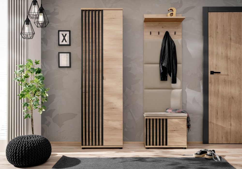 – Wąską szafę garderobianą, idealną do przechowywania ubrań, akcesoriów czy innych drobnych przedmiotów.