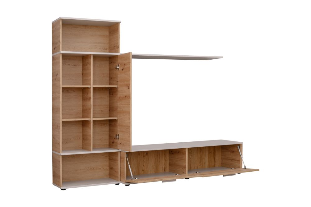 Prezentowana meblościanka dąb artisan REBEL to funkcjonalne i stylowe rozwiązanie, idealne do małych salonów, które zachwyci Cię nie tylko swoim designem, ale także atrakcyjną ceną. Składająca się z szafki RTV, regału półotwartego i długiej półki, meblościanka REBEL doskonale sprawdzi się jako centralny punkt aranżacji w Twoim wnętrzu.