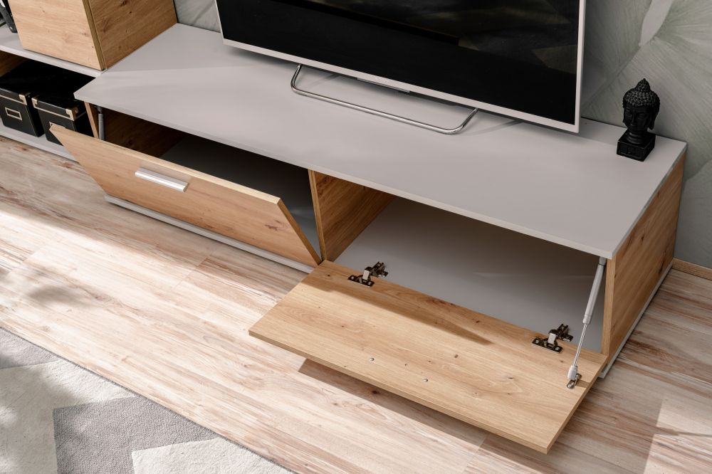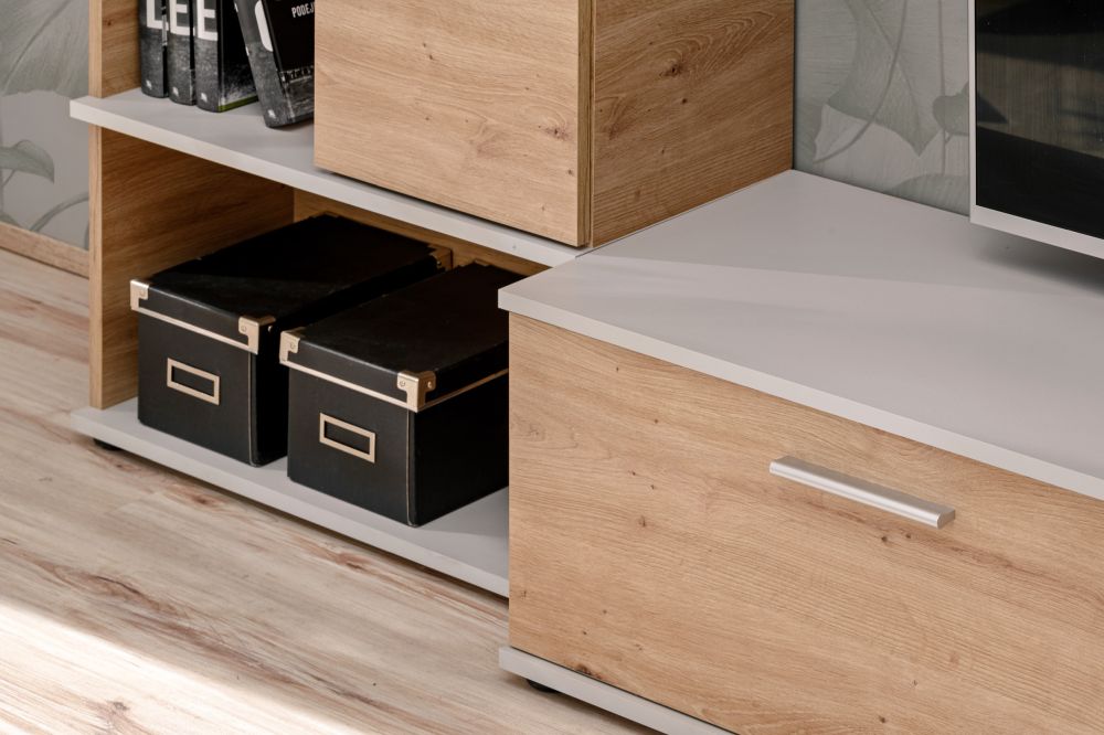 Kolorystyka meblościanki REBEL, w odcieniach dębu artisan i perła grey, nadaje jej nowoczesny wygląd, który łatwo dopasujesz do różnych stylów i kolorów wnętrza. Dzięki wysokiej jakości materiałom, takim jak płyta meblowa, meblościanka REBEL jest nie tylko estetyczna, ale także trwała i solidna.