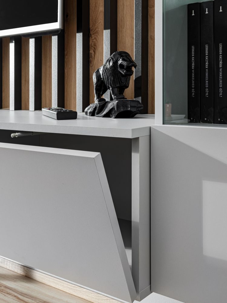- W zestawie znajdziesz zarówno RTV, jak i imponujący panel z lamelami, tworząc kompleksową aranżację idealną do Twojego salonu.