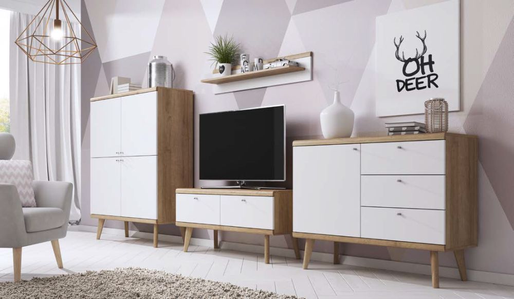 Zestaw składa się z komody, szafki RTV, półki oraz kolejnej komody, które umożliwiają przechowywanie wielu przedmiotów. Dostępne w kolorystyce dąb Riviera z białymi frontami, meble są idealne dla tych, którzy szukają wyjątkowego, ale jednocześnie funkcjonalnego zestawu.