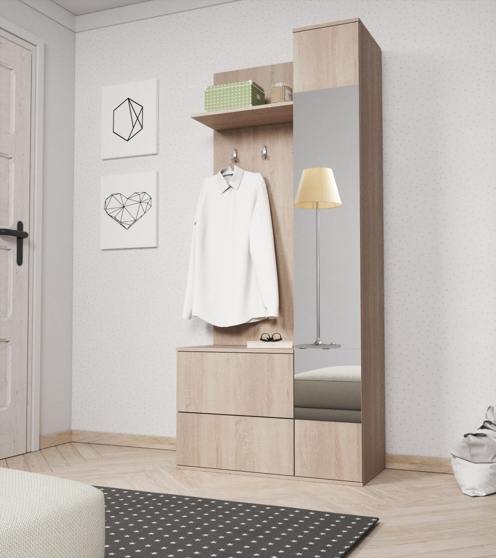 Minimalistyczna garderoba GRASS składa się z różnych elementów, które razem tworzą harmonijną całość. Wieszaki na kurtki i płaszcze zapewniają wygodne i porządne przechowywanie odzieży w najbliższym zasięgu. Szafka na buty pozwala na uporządkowane przechowywanie obuwia, eliminując bałagan w przedpokoju. Dodatkowo, kilka półek umożliwia przechowywanie dodatkowych akcesoriów lub ozdób. Niezwykle praktycznym elementem jest również długie lustro, które umożliwia nam szybkie spojrzenie na siebie przed wyjściem z domu, dodając zarazem wizualnej przestrzeni i optycznego powiększenia pomieszczenia.