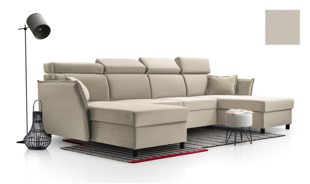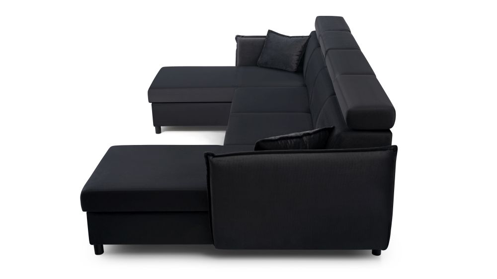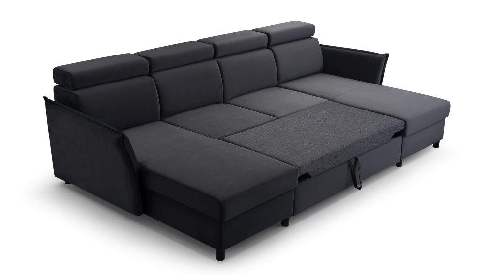 Jedną z największych zalet narożnika HONOR jest jego wszechstronność. Wyposażony w mechanizm rozkładania DELFIN, w kilka chwil zamienia się w wygodne miejsce do spania o powierzchni 264 x 129 cm. Dodatkowo, w bocznych modułach znajdziesz dwa praktyczne pojemniki na pościel, które pozwolą Ci zachować porządek. Cztery regulowane zagłówki oraz dwie ozdobne poduszki dopełniają całości, zapewniając komfort i estetykę w każdym detalu.