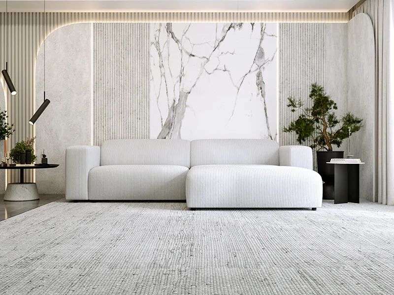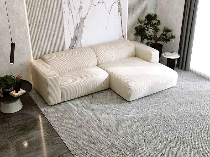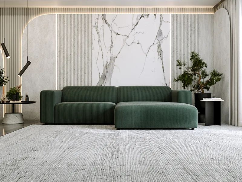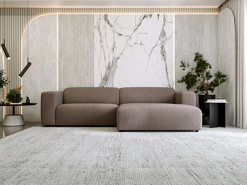 PASSO został stworzony po to, by zapewnić Ci maksymalny relaks po długim dniu. Dzięki swojej niskiej konstrukcji, narożnik ten w naturalny sposób zaprasza do odprężenia się i zanurzenia w jego wygodnych poduszkach. Każdy detal został przemyślany – od miękkich, zaokrąglonych kształtów, które otulają ciało, po szerokie oparcia i siedziska, które gwarantują komfort na najwyższym poziomie. Wysokiej jakości sprężyny faliste równomiernie rozkładają ciężar, co zapewnia długotrwałe wsparcie bez uczucia zmęczenia.