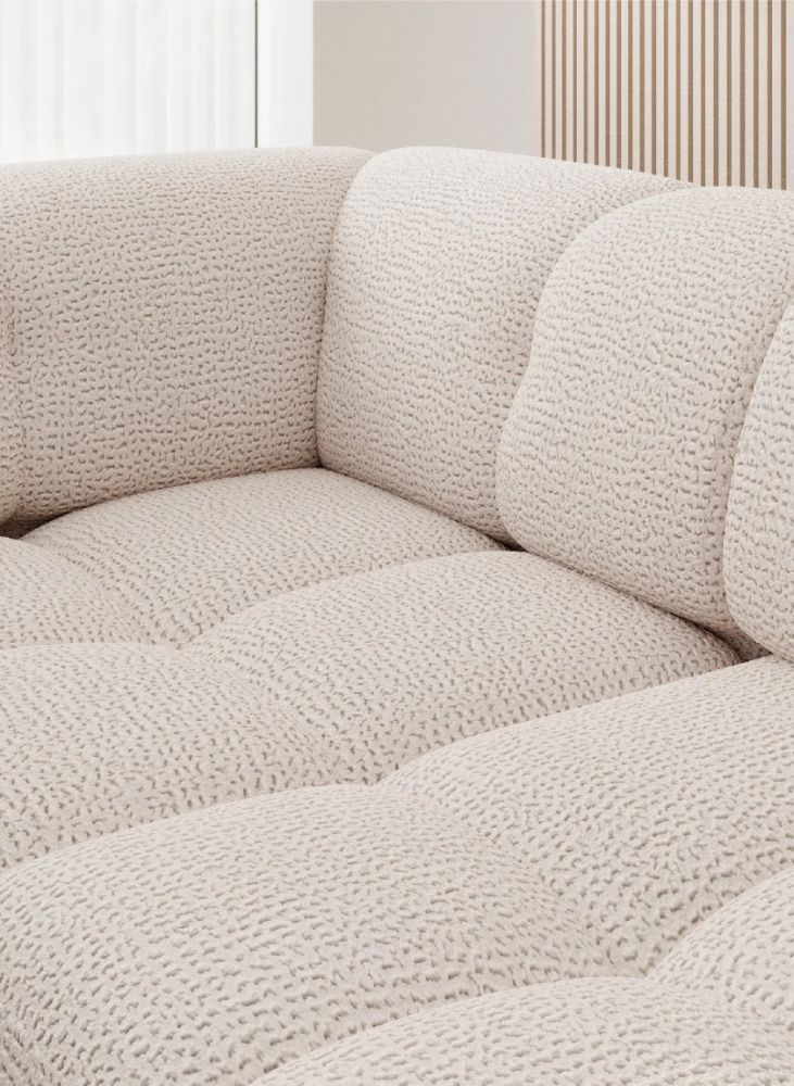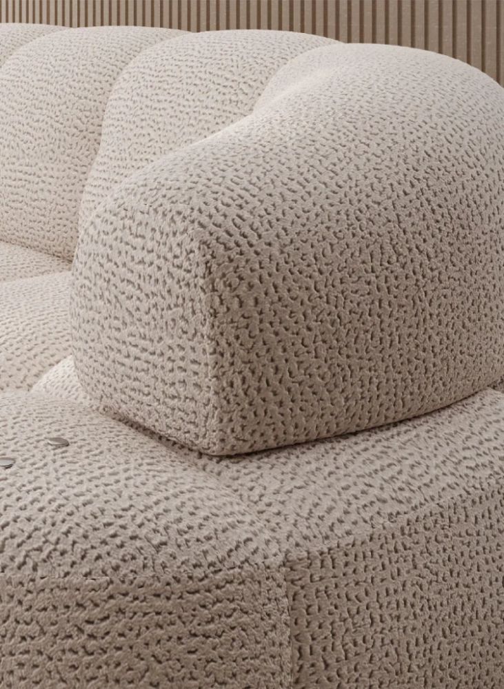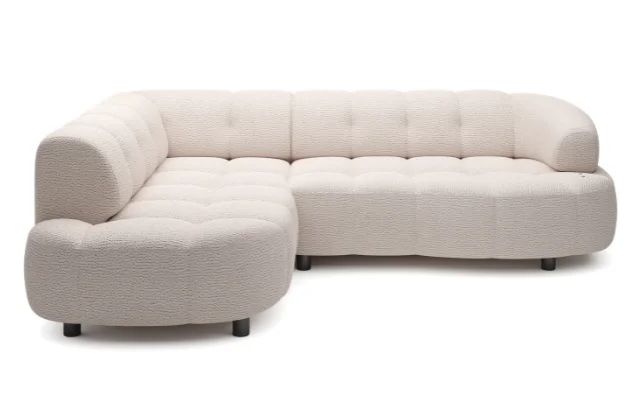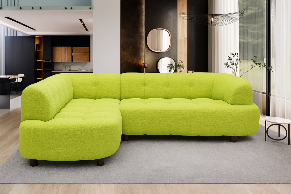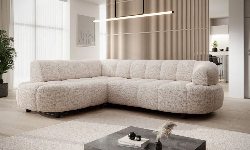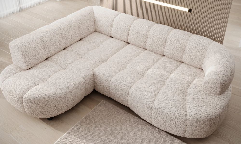 Jego lekka, L-kształtna bryła świetnie odnajduje się zarówno w przestronnym salonie, jak i w przytulnym mieszkaniu. Subtelnie zaokrąglone boki, delikatne przeszycia i ozdobne wciągi na siedzisku nadają mu wyjątkowego charakteru. Smukłe, czarne nóżki o wysokości 9 cm dodają lekkości i nowoczesnego wyrazu, a tapicerowany tył sprawia, że mebel wygląda doskonale z każdej strony – także ustawiony na środku pokoju.