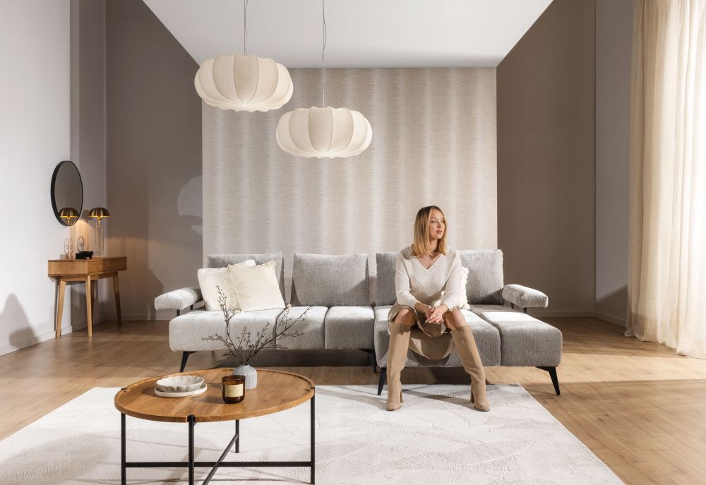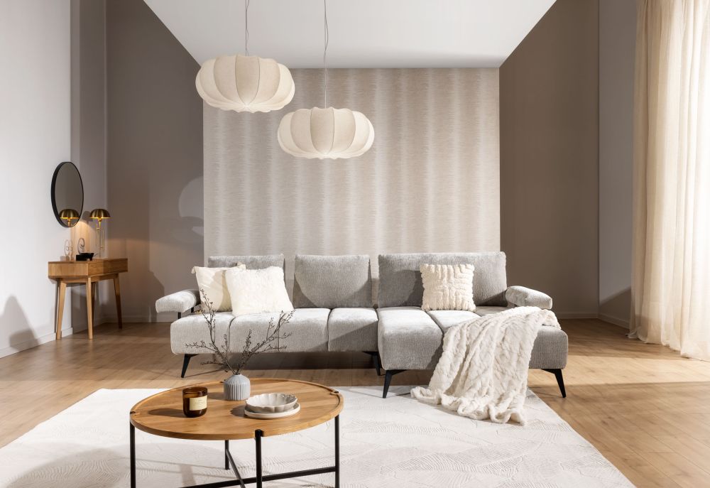 Plecy narożnika są w całości obite tkaniną, co pozwala na ustawienie mebla na środku pokoju, bez obaw o estetykę tylnej części. Taka aranżacja nie tylko podkreśla nowoczesny design narożnika, ale również sprzyja integracji rodziny i gości, tworząc przytulną i komfortową przestrzeń do wspólnego spędzania czasu.