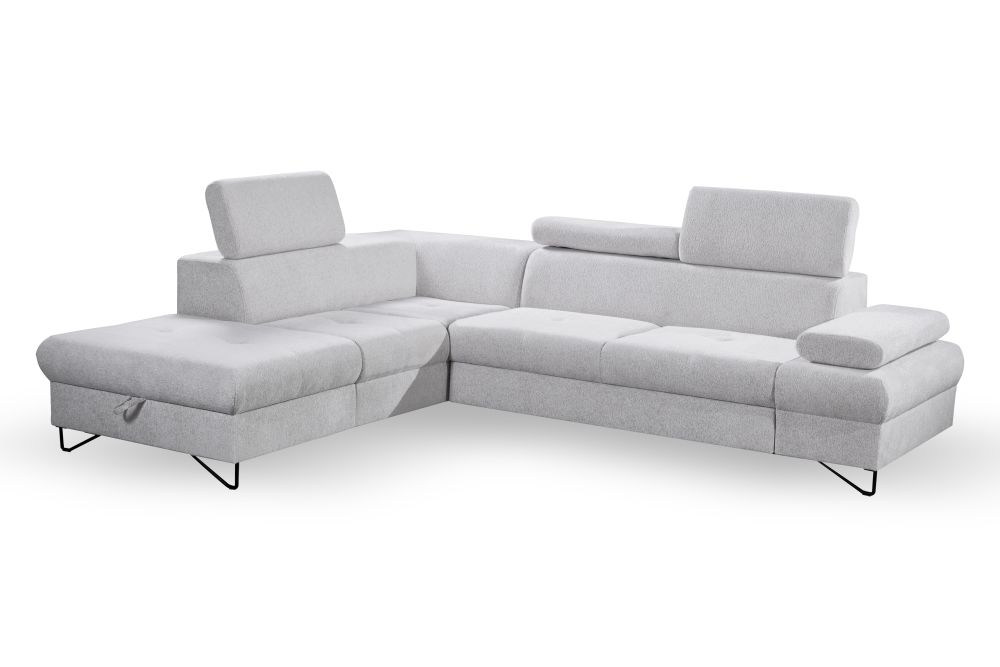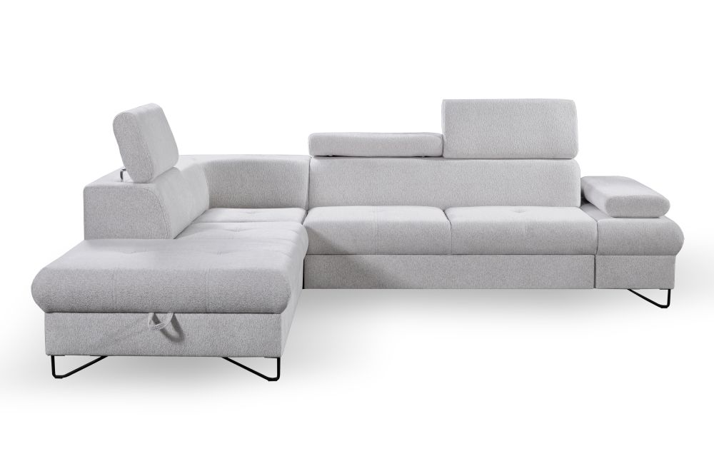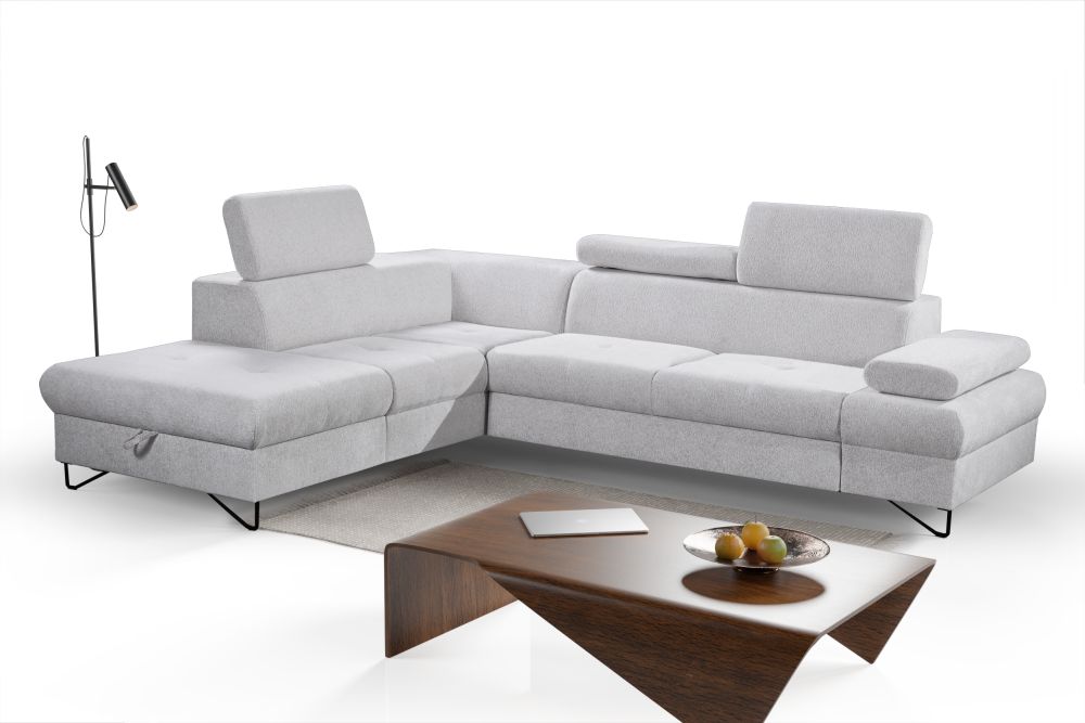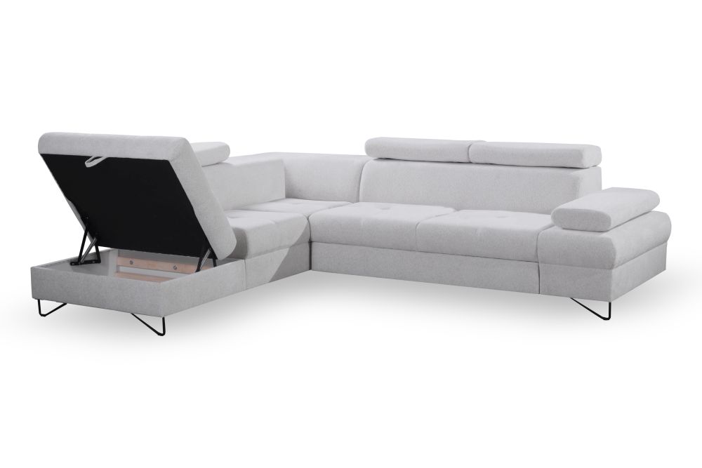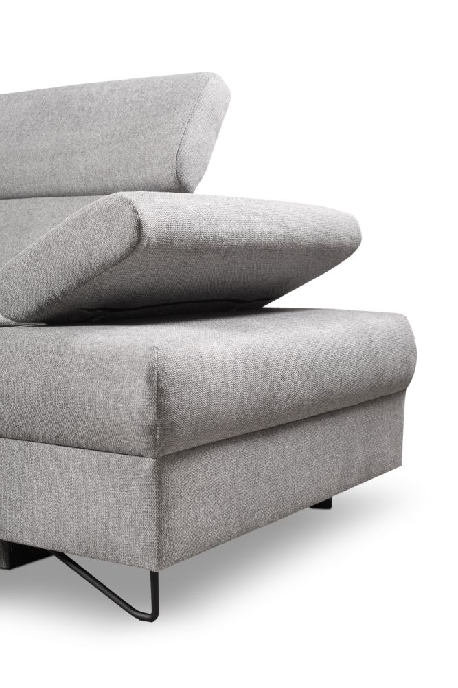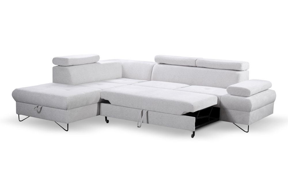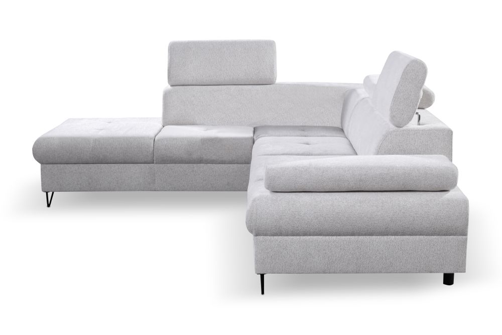 Dostępny jest narożnik lewy i narożnik prawy – prosimy o taką informację przy zamówieniu. Narożnik duży z regulowanymi zagłówkami i funkcją spania – znakomicie będzie pełnić funkcję jako duży narożnik do salonu, ale również narożnik do spania codziennego. Szybkie rozkładanie narożnika na wózku, oraz narożnik z dużym pojemnikiem na pościele pozwolą nam regularnie korzystać z mebla do spania.